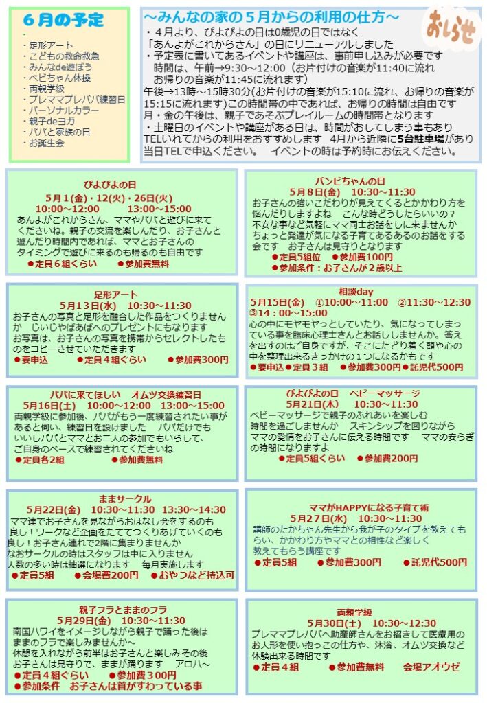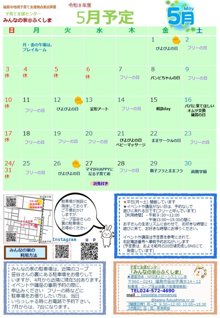 子育て支援センターみんなの家@ふくしま 2026年5月の予定表ができました!